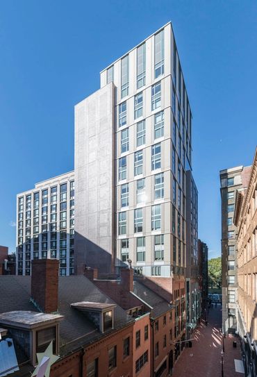 The Emerson College - Boylston Place Residence Hall Site comprises of 1, 2, and 3 Boylston Place and egress easement south of the properties 130 - 140 Boylston St. and east of Emerson Piano Row Residence Hall. The building is comprised of a new 18-story, 90,000-sf, 375-bed residence hall with views and adjacent walking to Boston Common. This was a critical building in meeting the need for more on-campus housing, while giving its creative students inspired spaces for community and connection. The residence hall incorporates the facade of the Ancient Landmark Building, an eclectic combination of Queen Anne and Romanesque revival architecture. Residence options include suites, singles, doubles, and triples. One of the hall’s defining design features is its five common rooms dispersed throughout: The Patio, The Flytower Lobby, The Kitchen, Odd Fellows, and The Loft.
